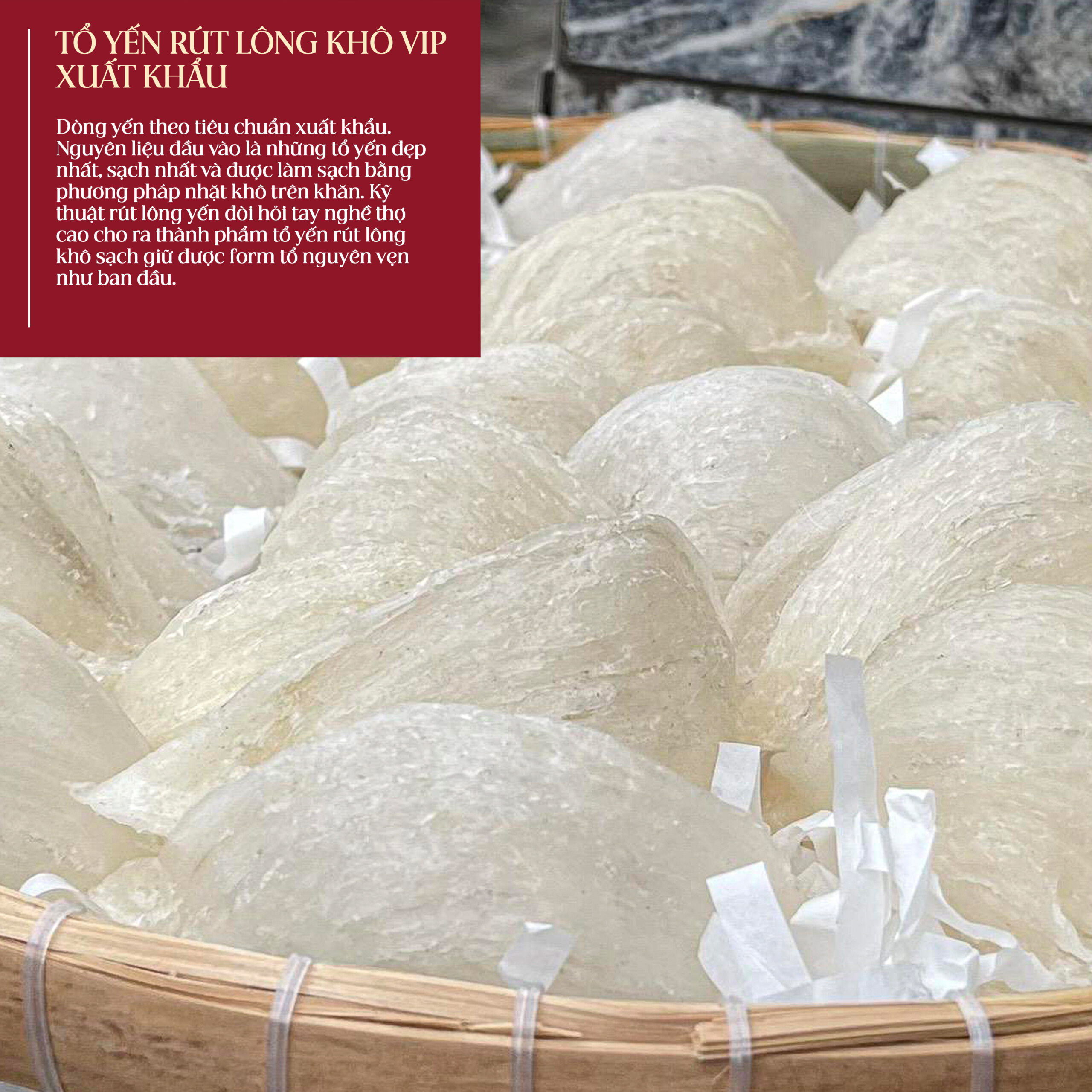 - Mô tả: Yến rút lông khô là dòng yến vừa đáp ứng yêu cầu thẩm mỹ, vừa đảm bảo giá trị dinh dưỡng. Đặc biệt thích hợp để làm quà tặng, quà biếu sang trọng. Tổ yến được tuyển chọn từ những tổ yến thô có hình dáng đẹp, kích thước to, ít lông và tạp chất.Yến được ủ ẩm hoặc phun sương, sau đó thực hiện rút lông hoàn toàn bằng thủ công. Chỉ những người thợ giỏi, tay nghề cao, nhiều kinh nghiệm mới có thể làm được việc này. Tổ yến sợi già chắc vì nhà yến lâu năm và được lựa tuyển rất kĩ và gắt gao. Yến được thu hái tại nhà yến sát biển nên đậm vị khoáng. Khi chưng nấu, yến nguyên chất sẽ có màu trong, mùi thơm tanh đặc trưng và sợi yến chắc từng thớ sợi.
